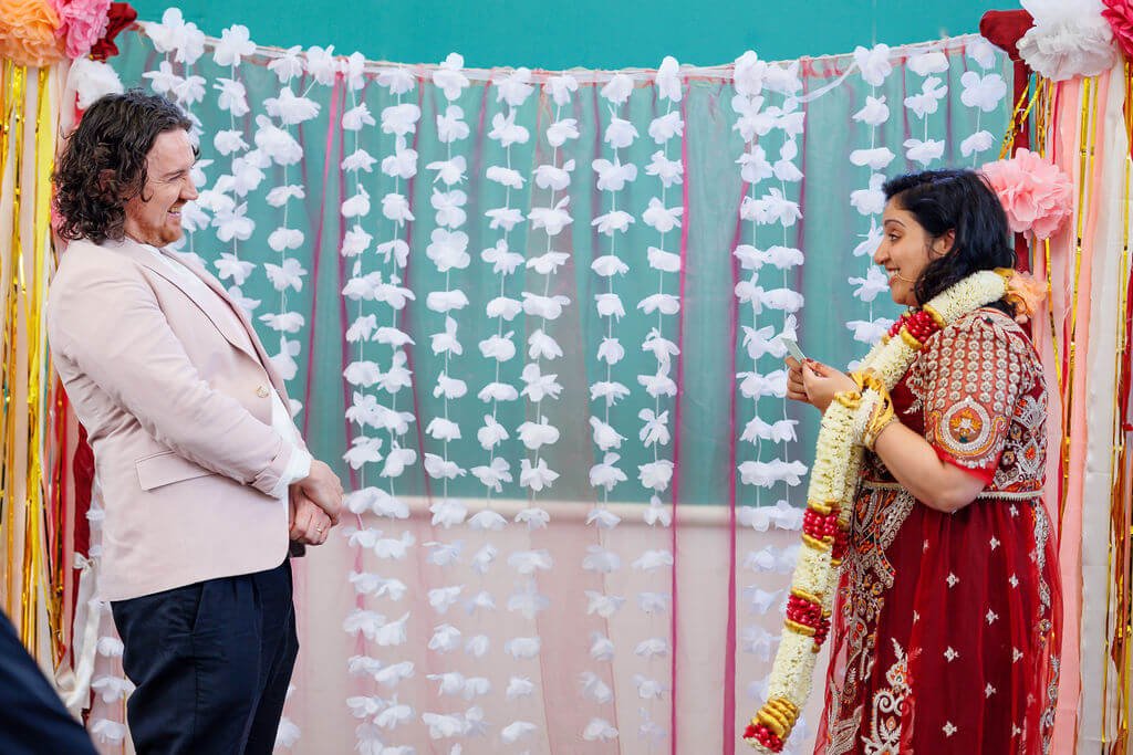A person in a pastel pink blazer and white shirt smiles during the garland exchange at a wedding ceremony. The other individual, in an ornate red and gold outfit adorned with floral garlands, stands before a colorful backdrop of pink and white flowers interwoven with gold streamers.